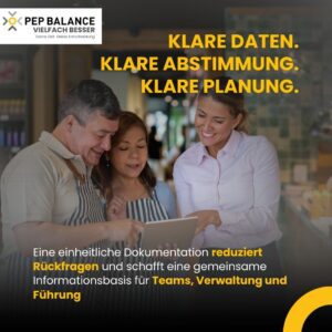 Verabschieden Sie sich von chaotischen Excel-Tabellen, unübersichtlichen Notizen und unstrukturierten Chatgruppen! Mit PEP BALANCE haben Sie alle wichtigen Informationen zur Zeiterfassung, Dienstplanung und Abwesenheitsverwaltung zentral in einem benutzerfreundlichen System gebündelt – für maximale Transparenz und Effizienz.